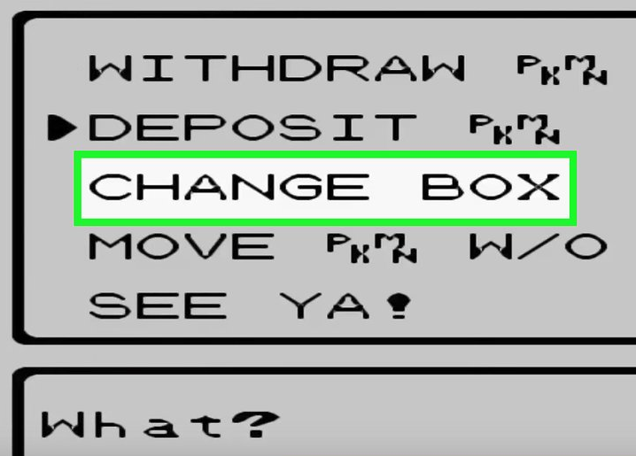 Nachdem du dein Pokémon abgelegt hast, kehre zum Hauptmenü von Bills PC zurück und wähle „Box wechseln“. Beim Wechseln der Box wirst du aufgefordert, das Spiel zu speichern.