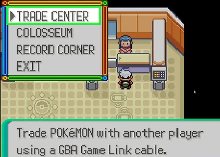 With both games ready, connect them using a Game Link Cable or compatible wireless adapter. Go to any Pokémon Center in both games and head upstairs to the trading floor. The center booth allows you to initiate a trade between the two versions.